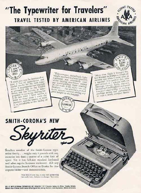Smith Corona developed a really portable machine for use on trains named appropriately, The Zephyr. After the war, with the popularity of air travel, the small, lightweight typewriter was renamed The Skyriter.
